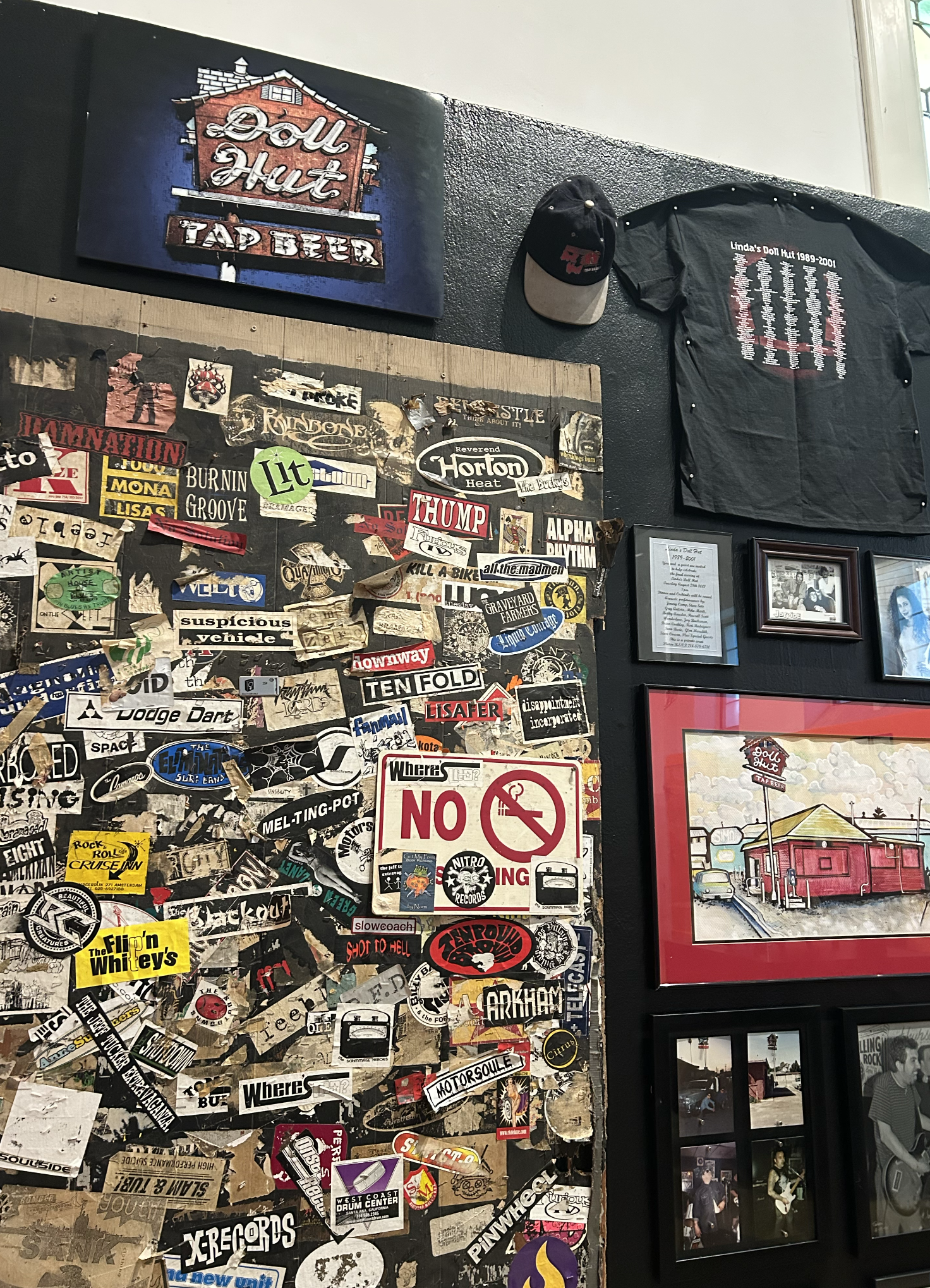 Wall panel and photos from the Doll Hut — the stomping ground of punk bands from across California.